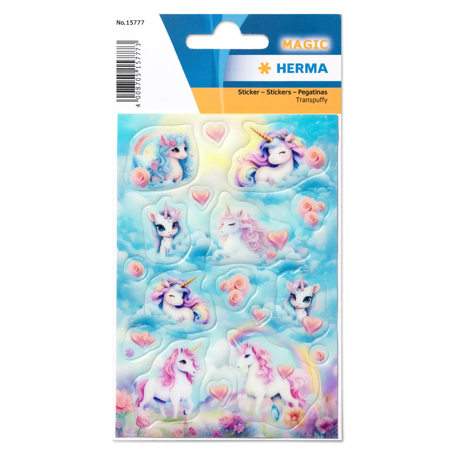 The "Happy Unicorns" stickers bring an enchanting world full of magic directly into the hands of little unicorn fans. Each pack contains beautiful rose, heart and unicorn stickers that enchant with their big, shining eyes. Framed by fluffy clouds, these stickers create a dreamlike scenery that inspires the imagination. Made from high-quality transpuffy material, they create a unique 3D effect. Ideal for little princesses and princes who want to add a touch of magic to their creative sticker games. The ‘Happy Unicorns’ stickers are perfect for decorating, collecting or giving as gifts and bring colour and joy to everyday life - a colourful adventure for all unicorn fans!