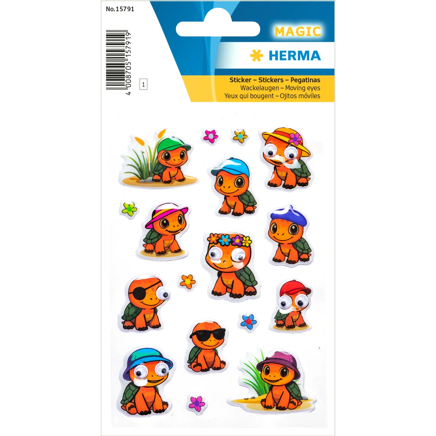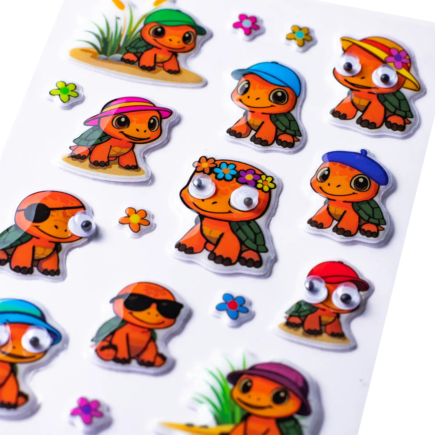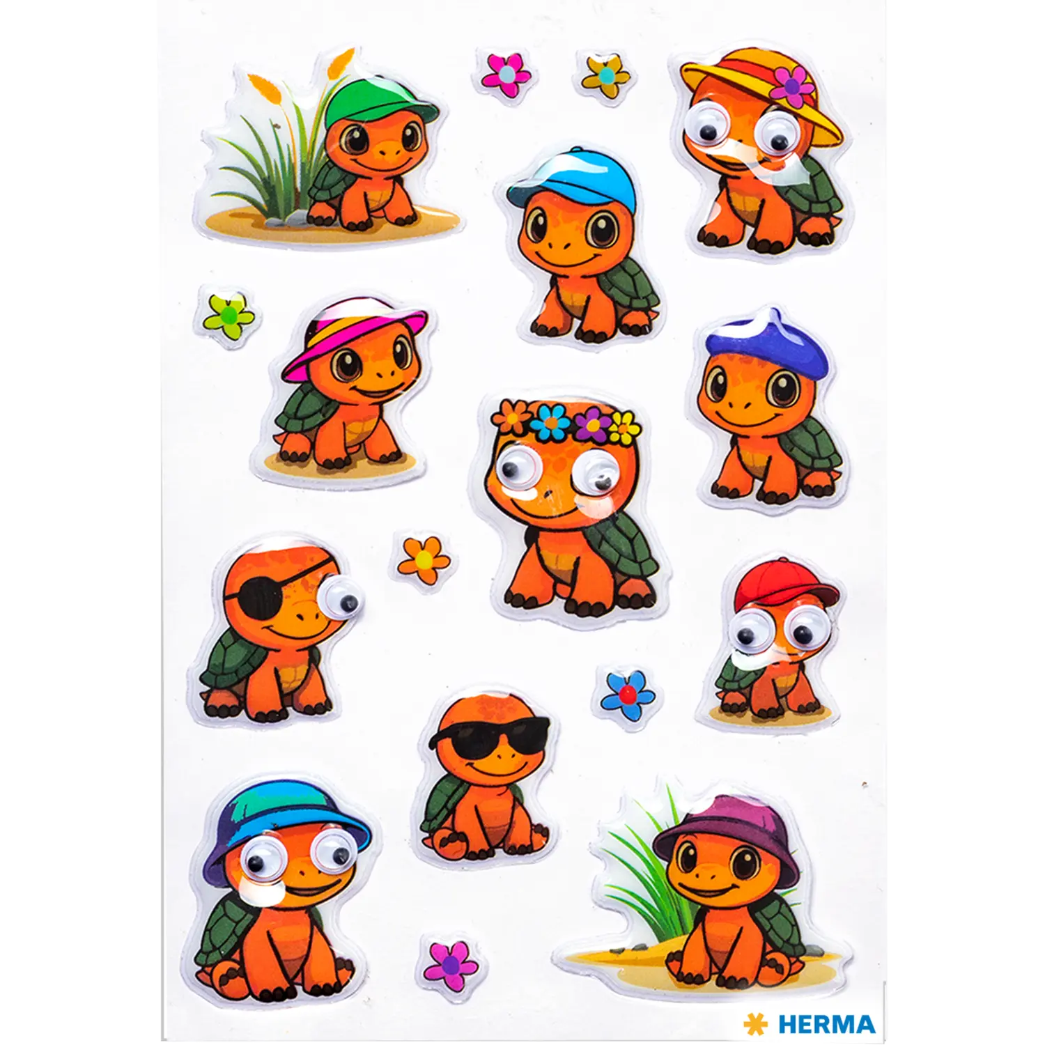 These turtle stickers combine cuteness with a playful dose of humor. Each turtle is presented with individual accessories from colorful hats to stylish glasses ensuring a constant stream of charming surprises. The special highlight is the movable googly eyes, which give the motifs a lively and unique expression. This lovely finishing touch makes the stickers particularly original and immediately brings a smile to your face. Ideal for collecting, decorating, or giving as gifts, the turtles spread good cheer everywhere and add eye catching accents. A detailed set that stimulates creativity and enriches any sticker collection with its distinctive look.