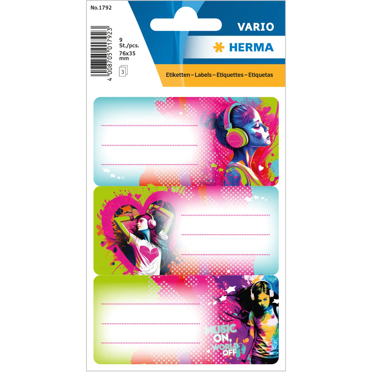 Music on, world off. That's the motto of Music Girl. Perfect for all dreamers who love to lose themselves in music: these school labels in a very special style with the “Music Girl” design in 76x35 mm format c ombine design and functionality. Simply write on the self adhesive paper stickers by hand, peel them off, stick them on, and you're done. This way, no books or notebooks can be mixed up at school, kindergarten, or among friends.