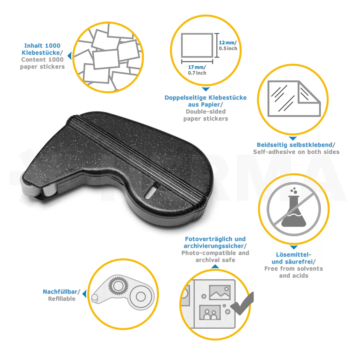 In contrast to Transfer glue dispensers, Vario tab dispensers apply paper stickers measuring 12 x 13 mm. These stickers adhere permanently, which makes them ideal for archiving and for handcrafts with wood, cork or film.