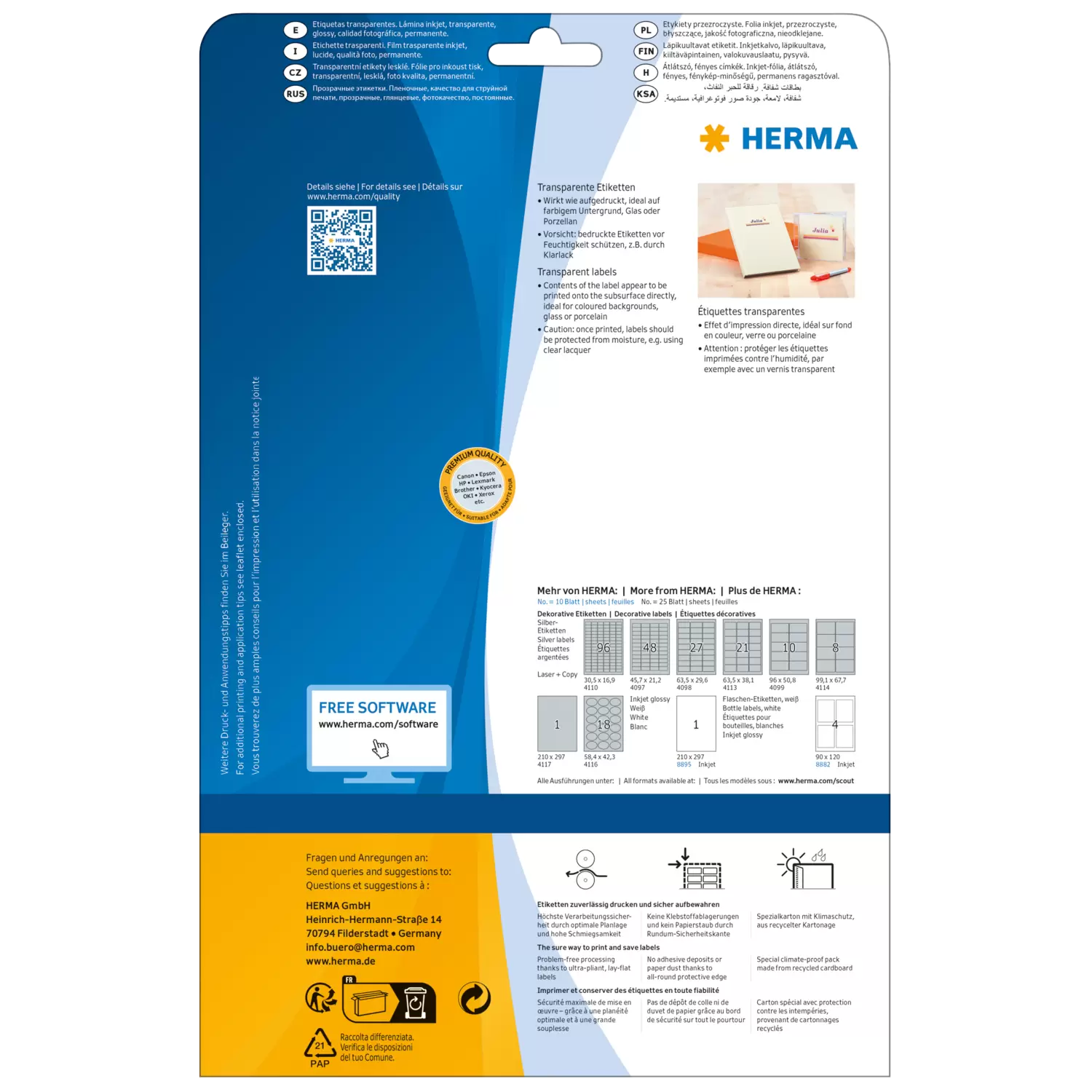 Transparent inkjet film labels A4, 210 x 297 mm, glossy, permanent adhesion