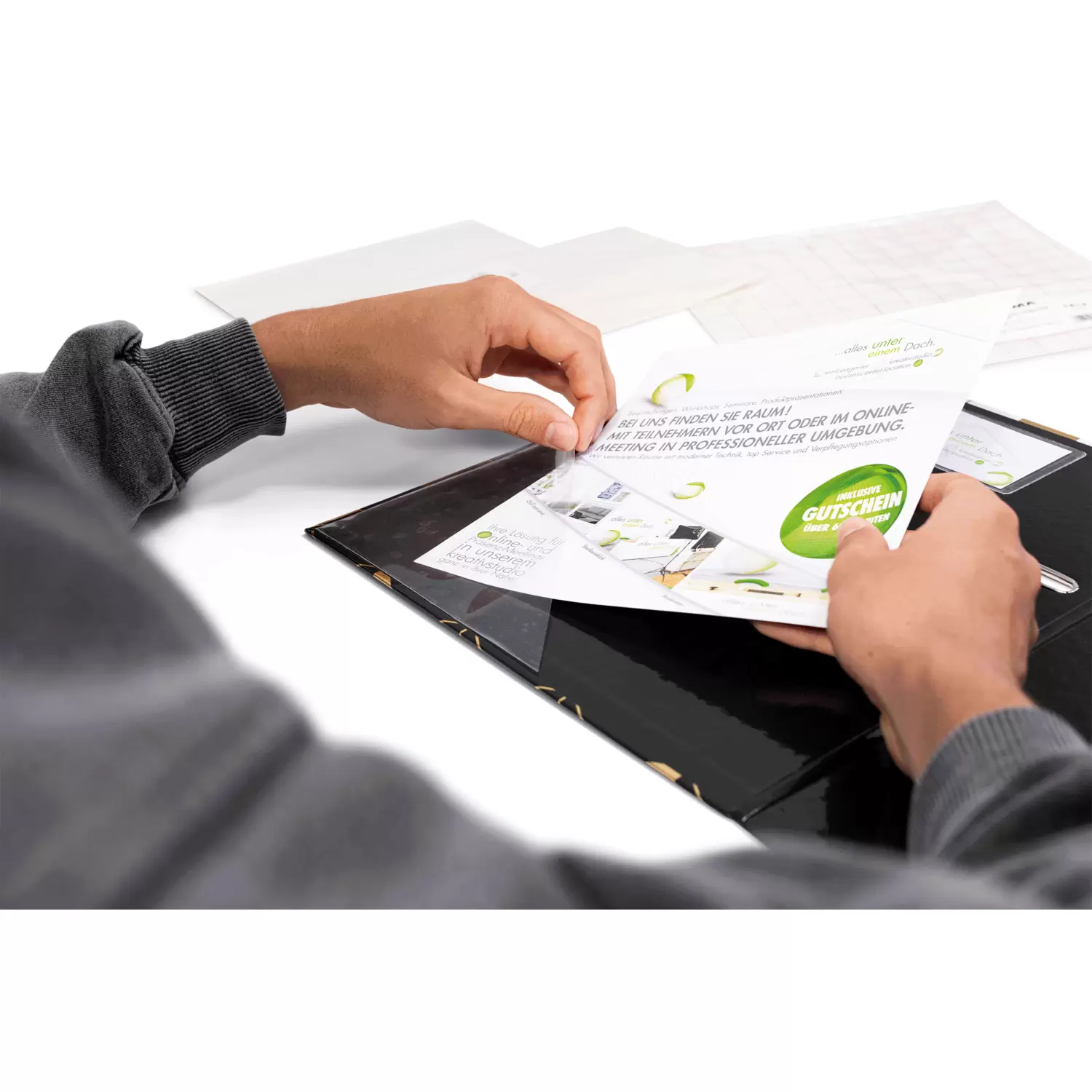The practical extra pocket for sticking in albums, files and ring binders, offer and presentation folders: HERMA's transparent self-adhesive pouches. The triangular pouches, also known as adhesive corners or book card pockets, are made of crystal-clear polypropylene film with a side length of 17 cm, making them ideal for smaller documents such as business cards or flyers, brochures and overview sheets. The triangular pouches are easy to attach, self-adhesive and adhere firmly to smooth surfaces. So documents that are often used such as calendars, timetables or To Do Lists, but also business cards or brochures for business appointments are always at hand. Simply peel off the backing paper, stick the triangular pocket in the position you want, insert the papers and use previously unused space wisely. Clever and practical.