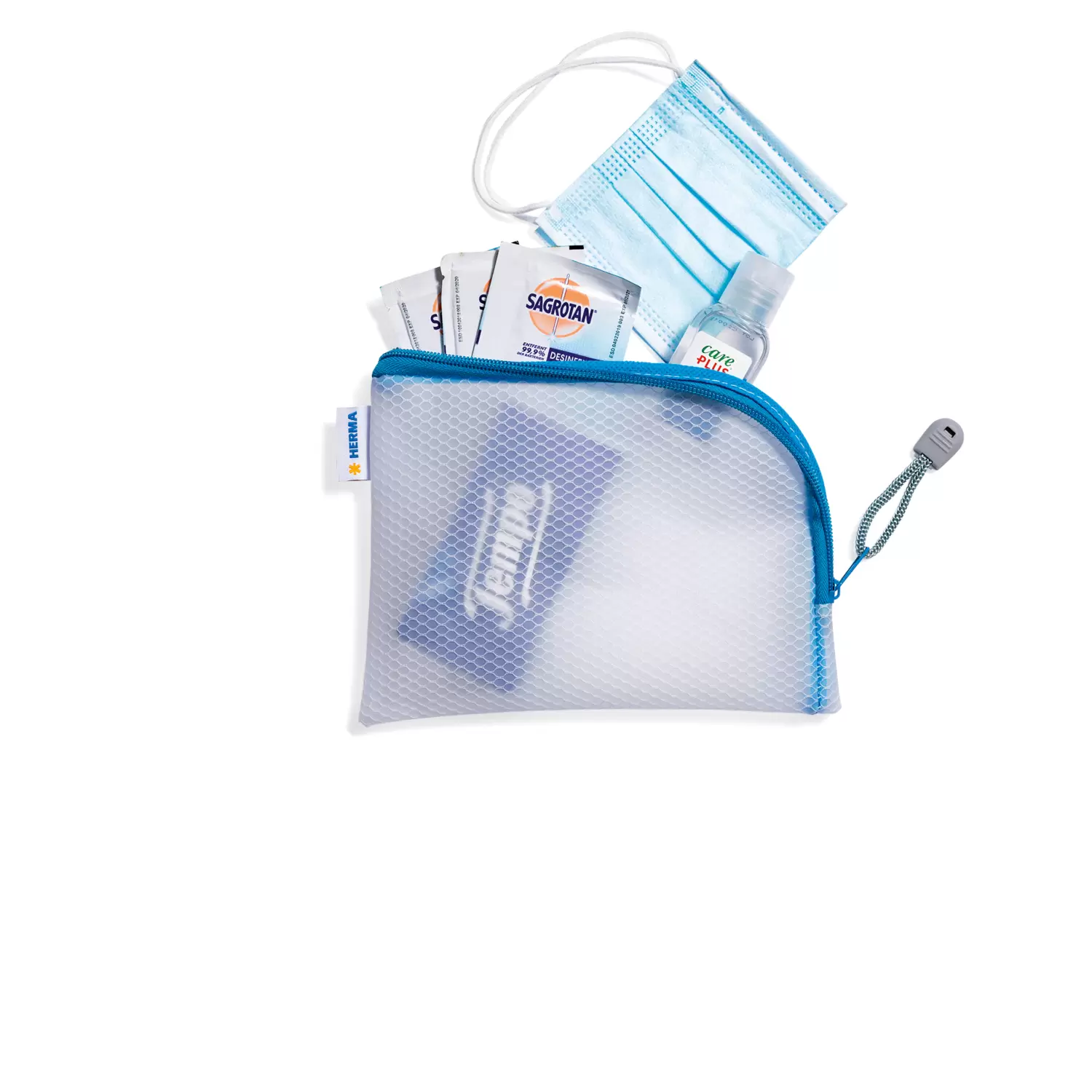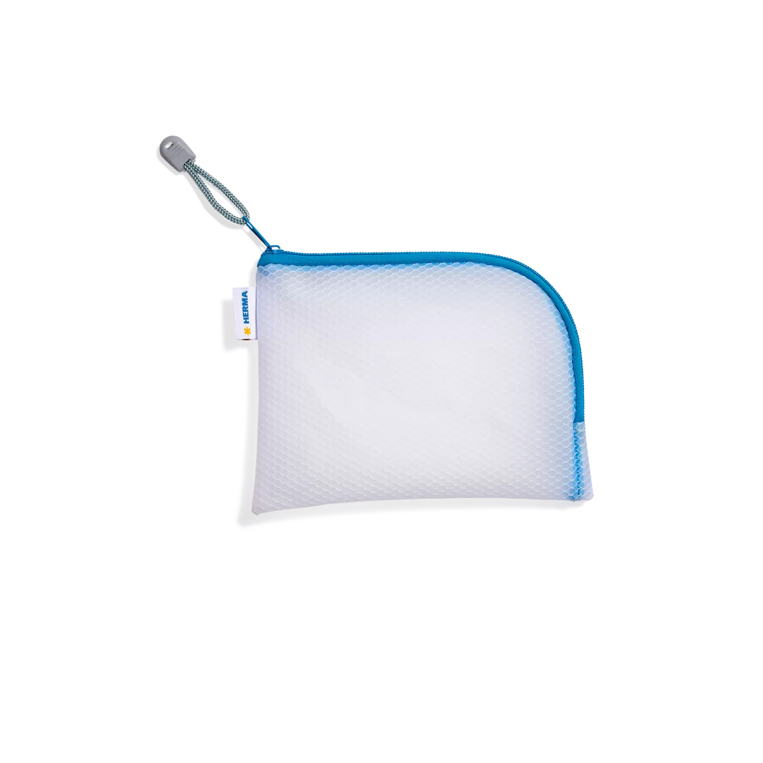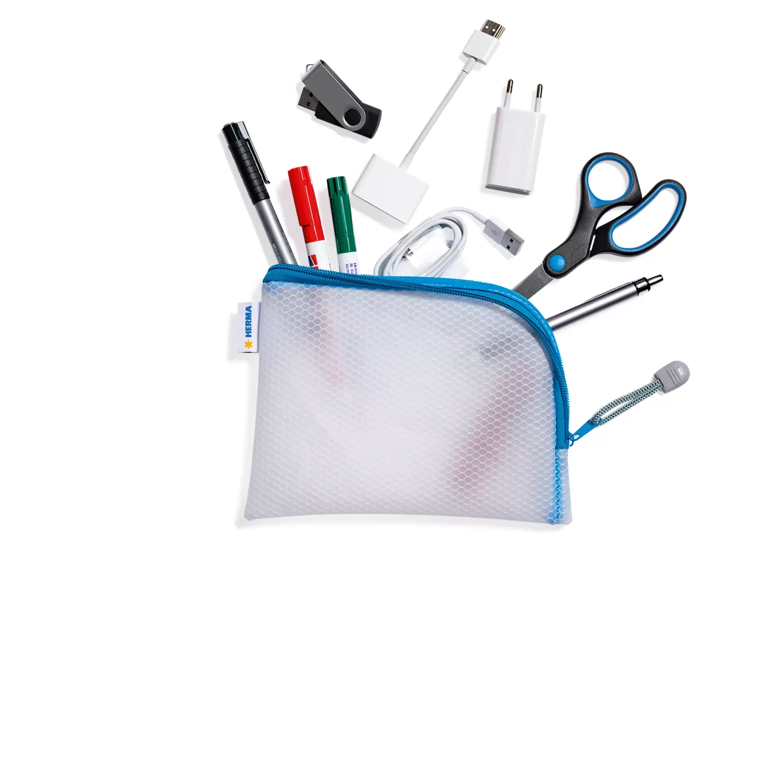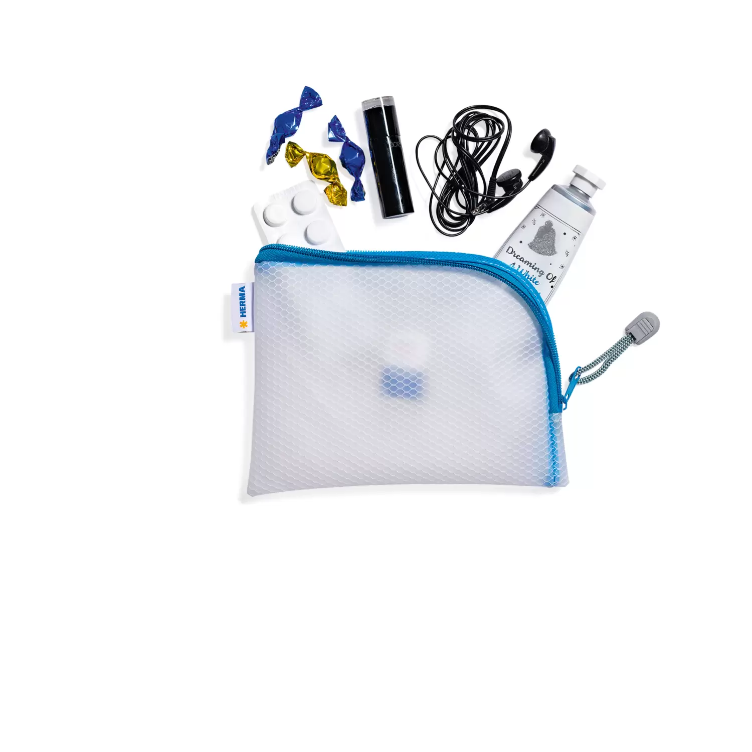 The HERMA Universal Bag A6 (19 x 14 cm) with the practical corner zip in blue. The semi-transparent bag is a true all-rounder, for collecting, sorting and archiving. Everything perfectly stowed away – when travelling for small things, as a personal bag in the office, bathroom or workshop. The sturdy, mesh-reinforced, transparent foil allows a clear view of the contents and provides perfect protection against dirt, grime and moisture. The material is characterised by its special durability and is abrasion-resistant. These storage and sorting wonders are available in many more sizes and colours.