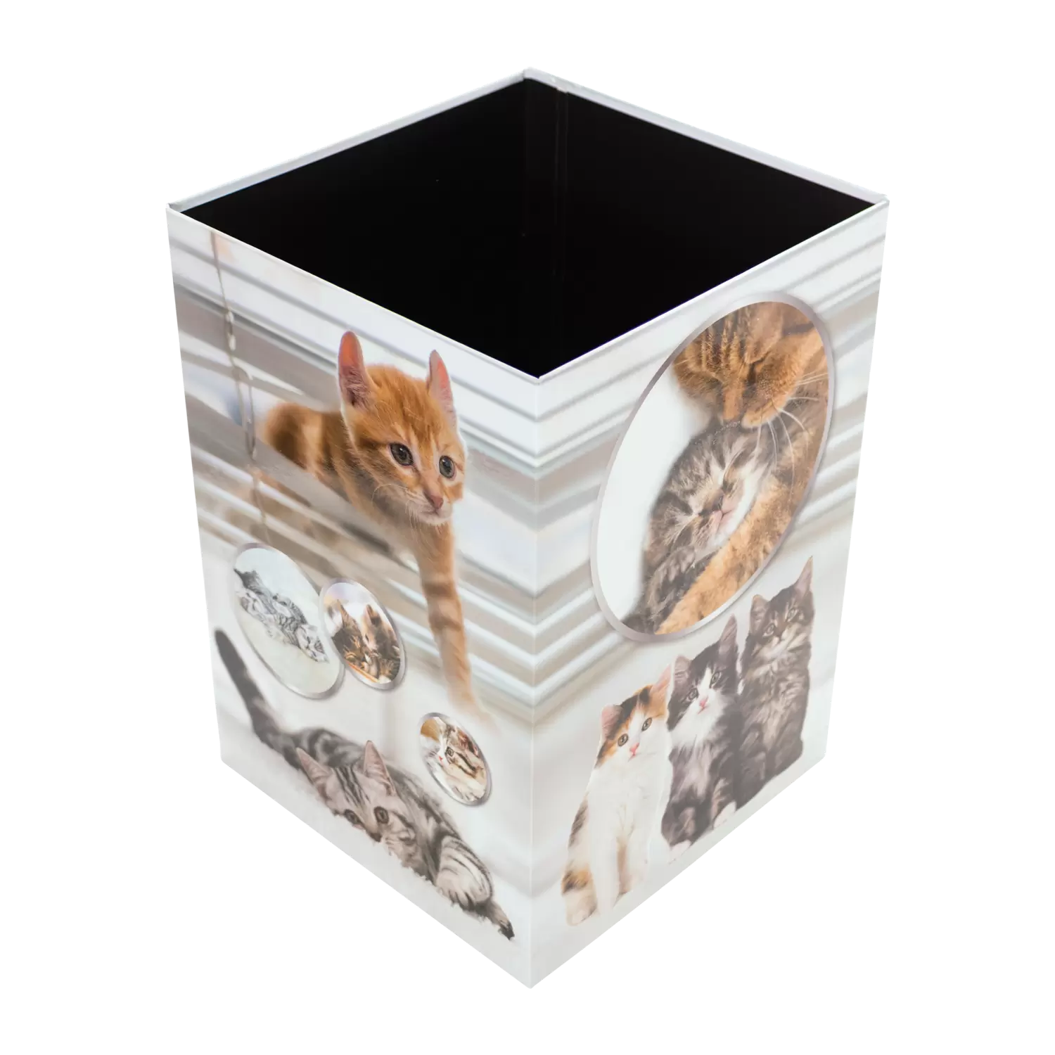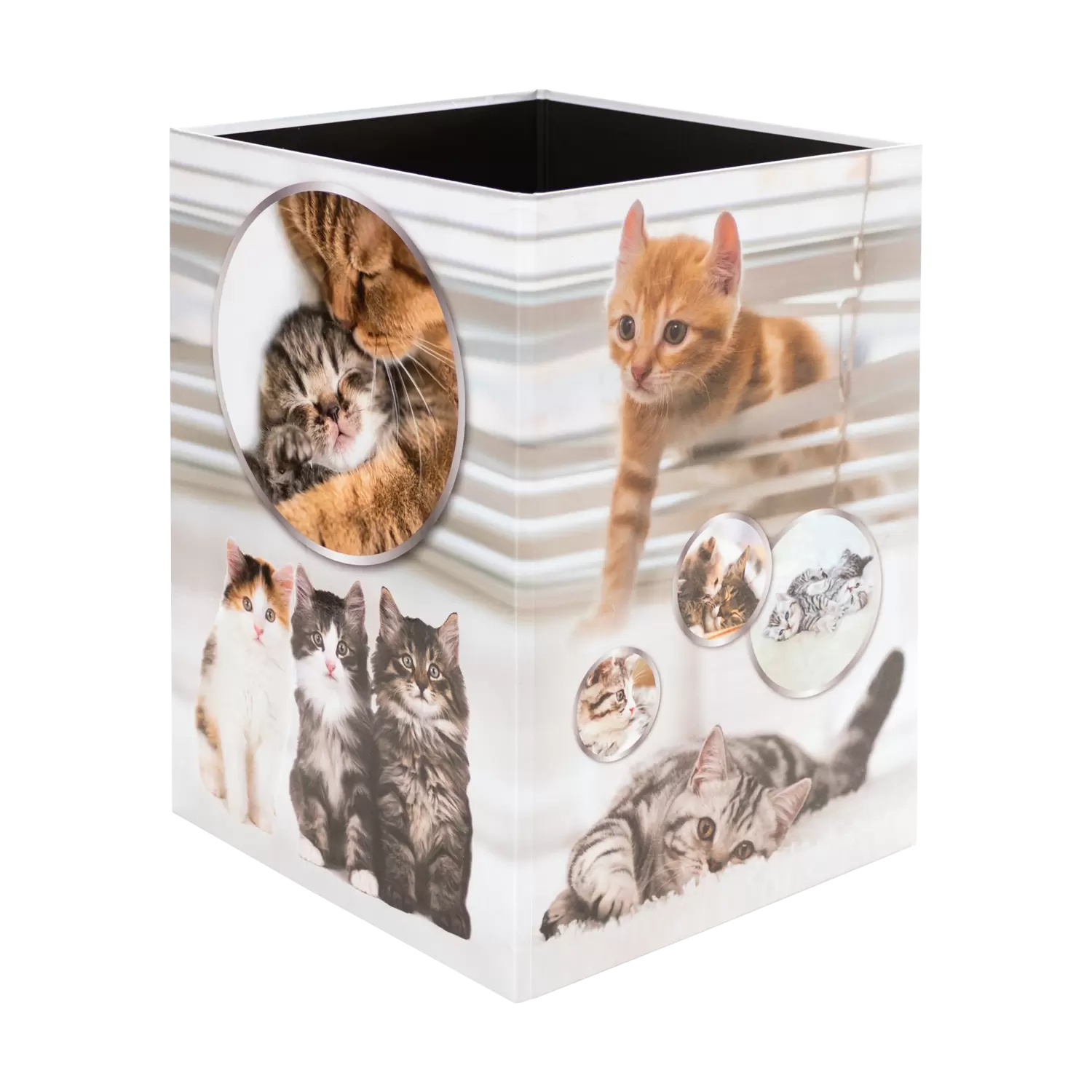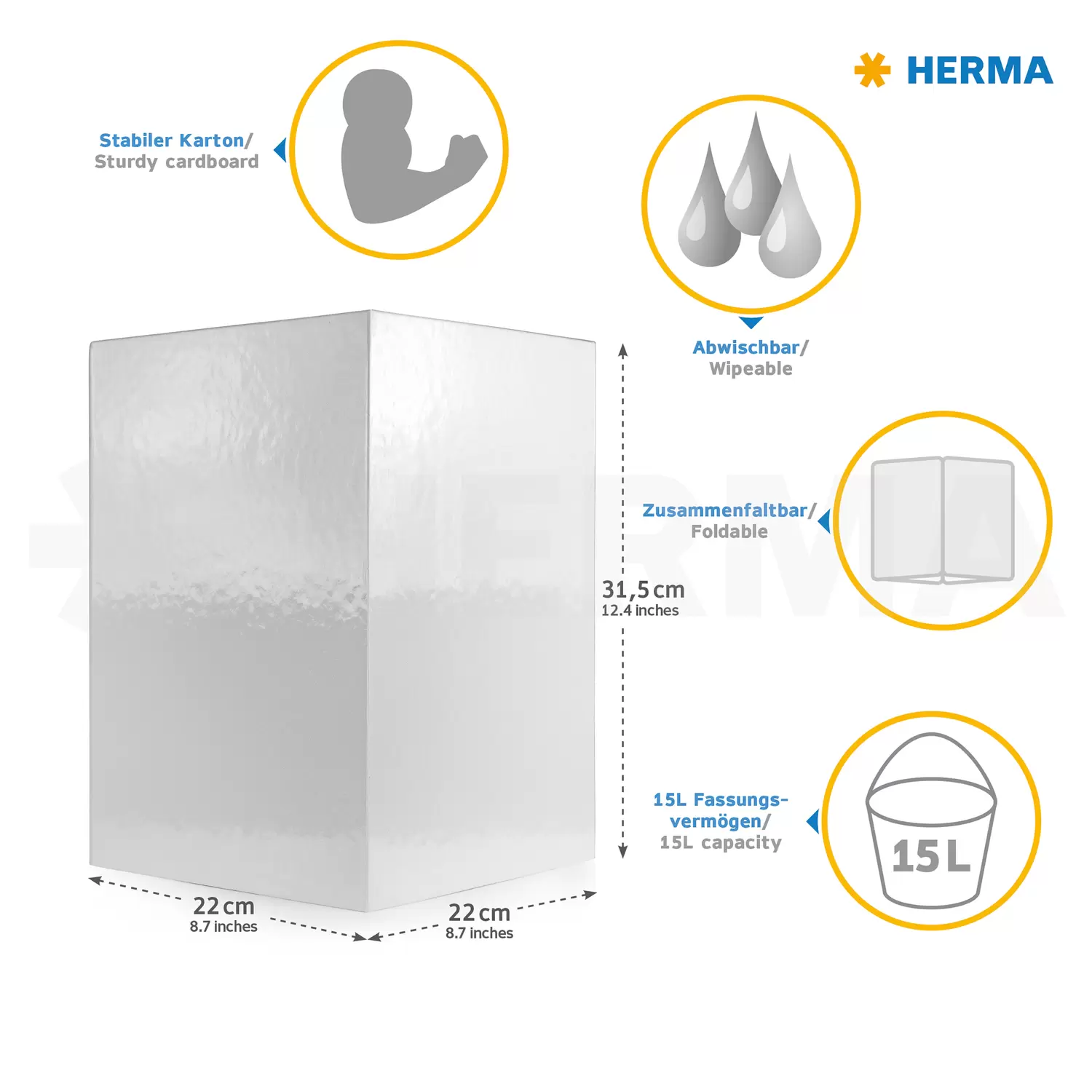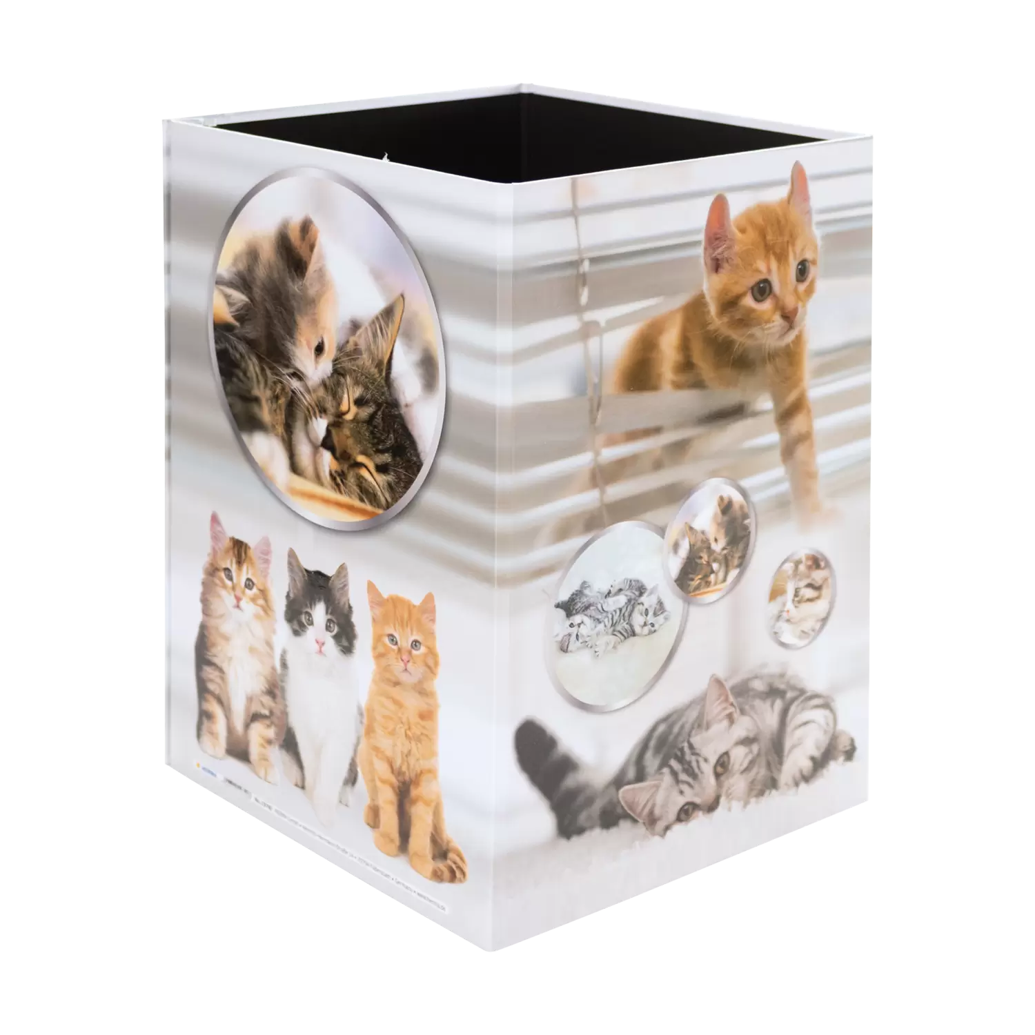 This cool designed waste paper bin is the hit for all cats fans! Practical and beautiful to look at, a real eye-catcher under the desk. The waste paper bin is made of sturdy cardboard and has a capacity of 15 liters, so it fits under any desk. The coated surface makes it wipeable and easy to clean. Keeping things tidy made easy. With HERMA. Discover the products of the popular cats series: folders, motif files, desk pads, stickers and more! Great design, popular with young and old - pretty as a purr.