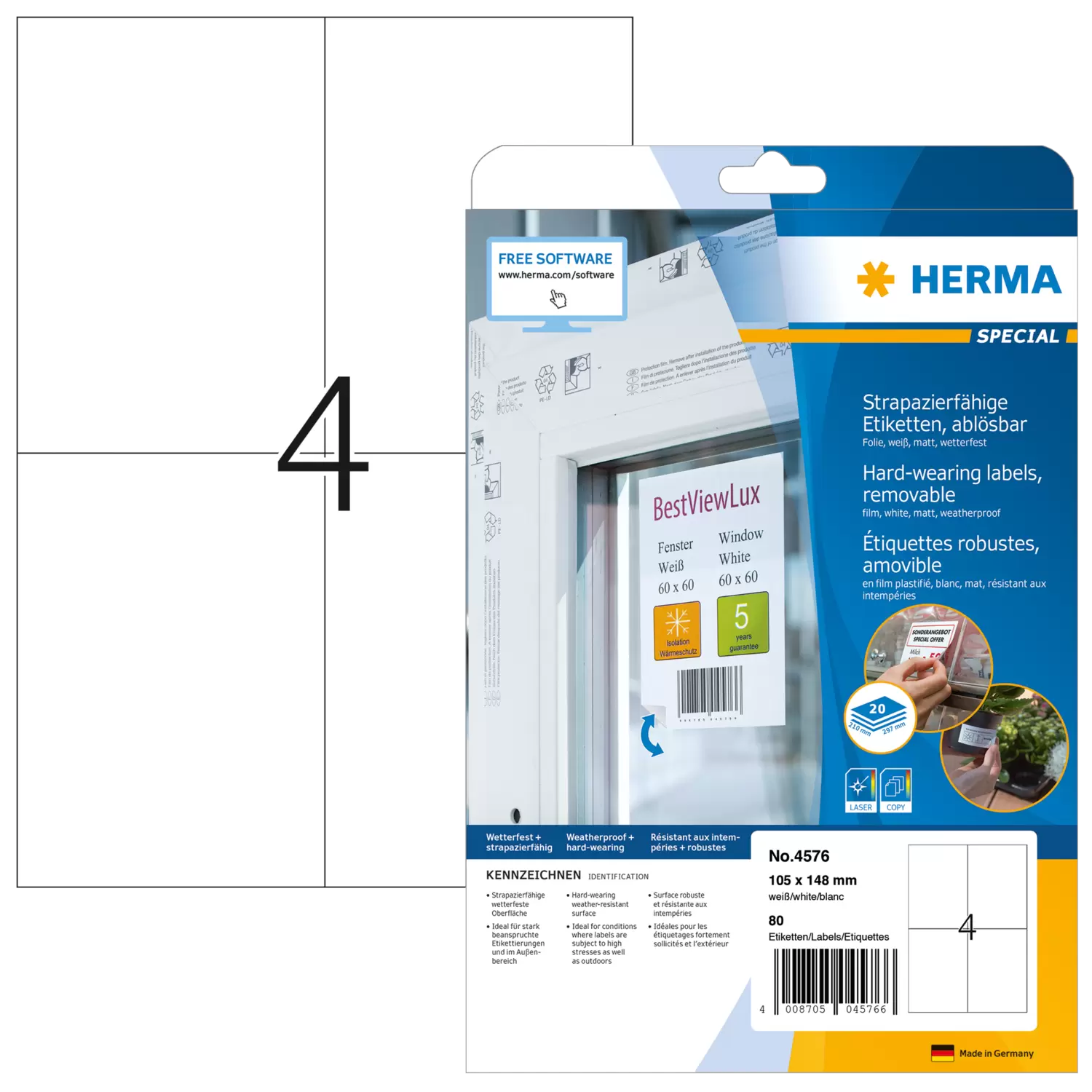 Weatherproof film labels A4, 105,0 x 148,0 mm, white, removable